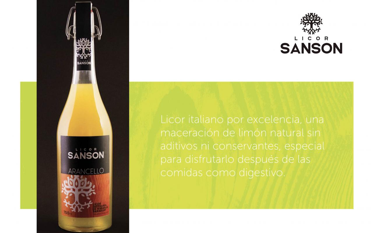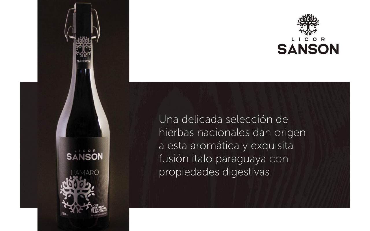 Los licores Sanson son un producto italo-paraguayo, elaborado artesanalmente con tradicionales recetas de familia; por ello, su etiqueta debía reflejar la identidad de la marca, lo cual se logró mediante una metáfora alusiva al árbol genealógico y una textura de vetas de madera, elementos implementados en el branding que le dan sentido y valor único en el mercado.